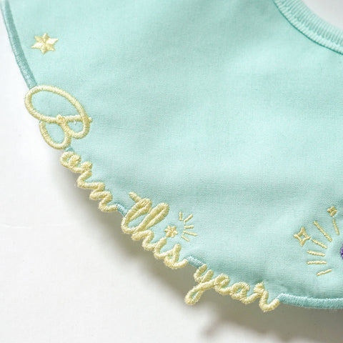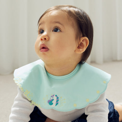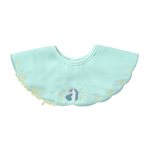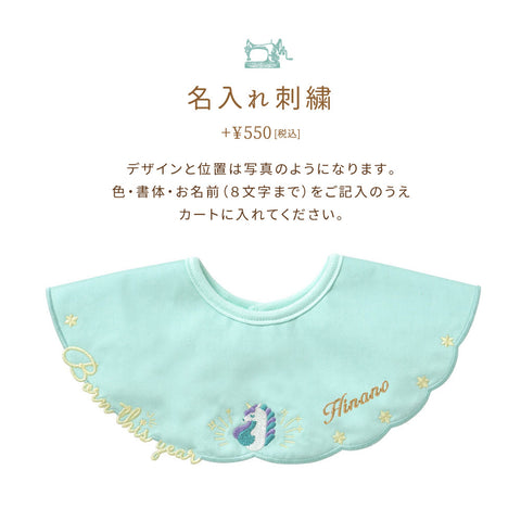 日中はもちろん、睡眠時も使えるおくるみとユニコーンのぬいぐるみ、刺繍スタイの3点セット。