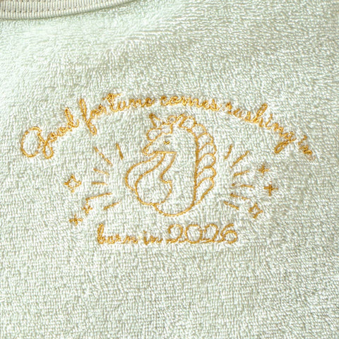 胸元にはゴールドで、"Good fortune Comes rushing in(幸運が押し寄せる) born in 2026”の特別な刺しゅうを施しました。