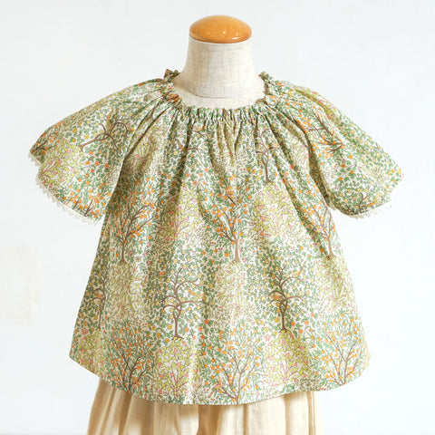 ・リバティの〈Jess and Jean〉木々の中にお花や鳥などが描かれた可愛らしいテキスタイル。