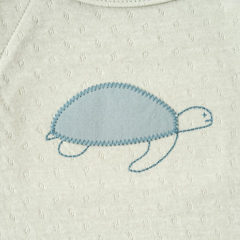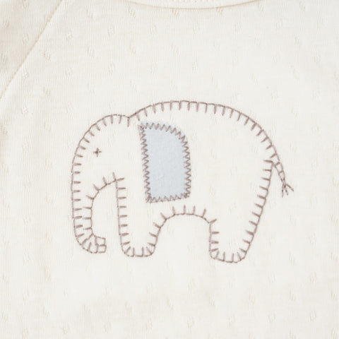 赤ちゃんを優しく包み込む、オーガニックコットンの生地で作った2wayオール。袖口はひっくり返せばカバーにもなり、皮膚をこすってしまう赤ちゃんの手を保護することも可能です。 キナリはアジアゾウ、グリーンはタイマイのモチーフで、アップリケ刺繍を入れています。