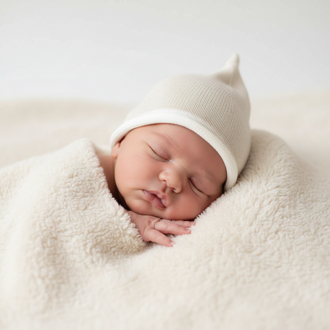 とんがりフォルムがキュート。ふっくら柔らかベビー帽子。