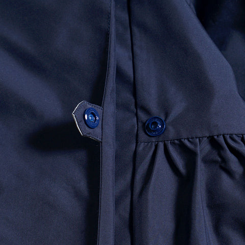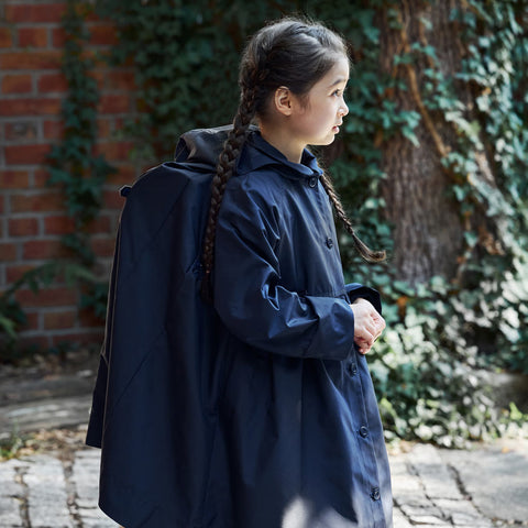 リュックやランドセルの上から着用頂けるように、背中に深いタックを入れています。タック部分はスナップボタンで簡単に開くことが出来ます。