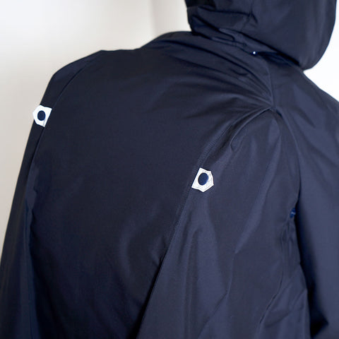 袖の内側には雨の侵入を防ぐゴムと頭を守るフードがついており、どちらも取り外しが可能。防寒コートとして使う場合はすっきりとお使い頂けます。
