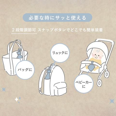 ・2段階調節可能なスナップボタンでバッグやリュック、ベビーカー等に簡単に装着できます。