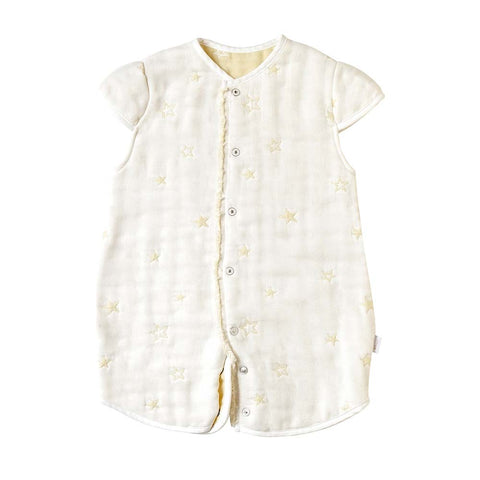 ふくふくガーゼのスリーパーは愛知県三河地方で通常の何倍も時間をかけてゆっくりと織られています。6枚の重ねられたガーゼはそれぞれ違った織り方や密度でつくられ、洗うほどにやわらか。多くのお客様が「ほかの6重ガーゼと全く違う」と驚かれます。赤ちゃんの快適な眠りを願って作られた特別なガーゼです。