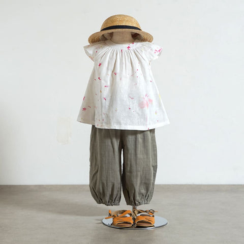 ・生成りの生地でぽつぽつとした黒い点が見られる場合がありますが自然な風合いを生かした綿の葉や茎の一部です。