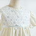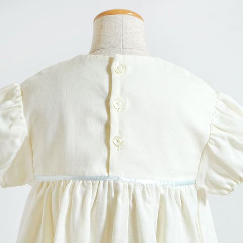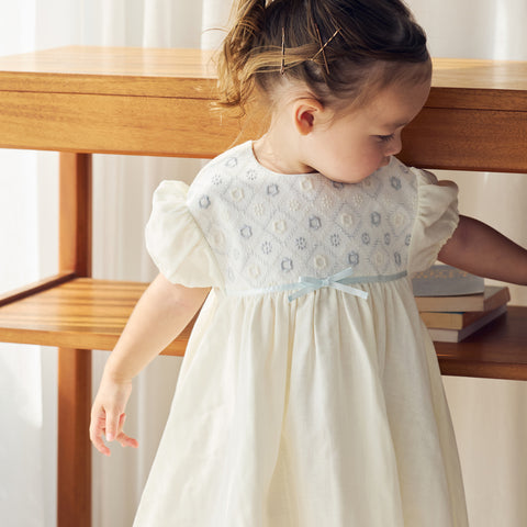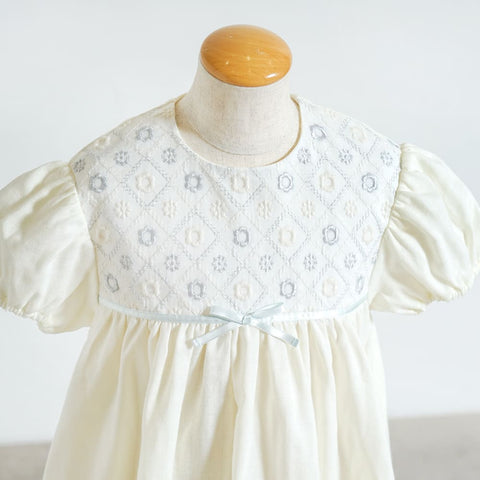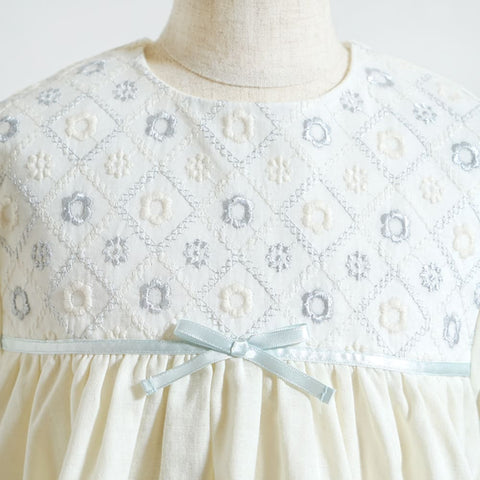 お花刺繍の生地にWガーゼ生地を合わせ、ウエストにはサテンリボンをポイントに付け上品な一枚に仕上げました。