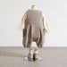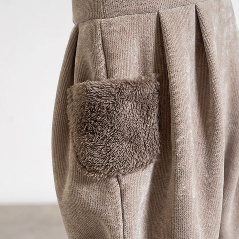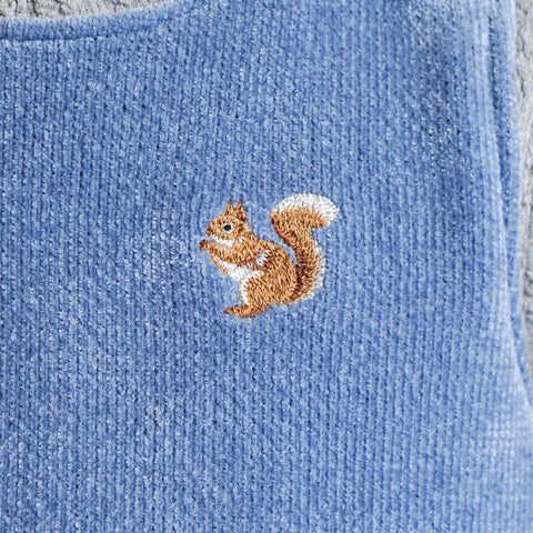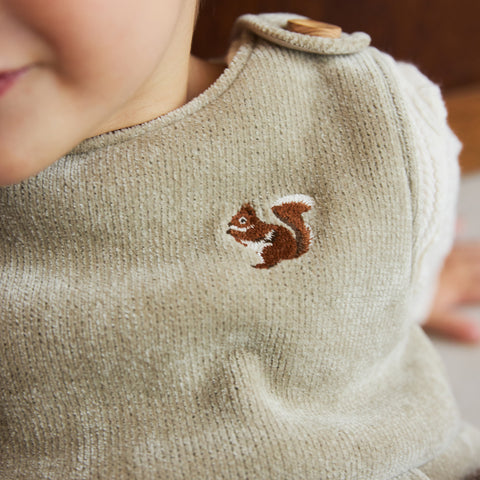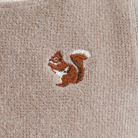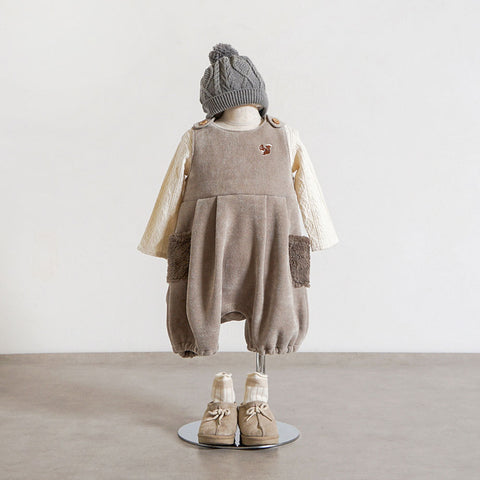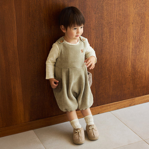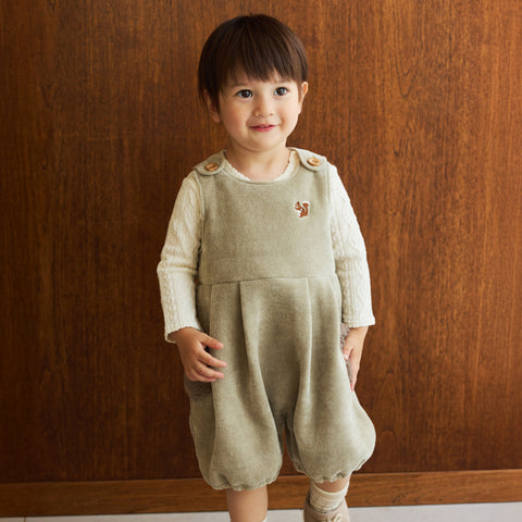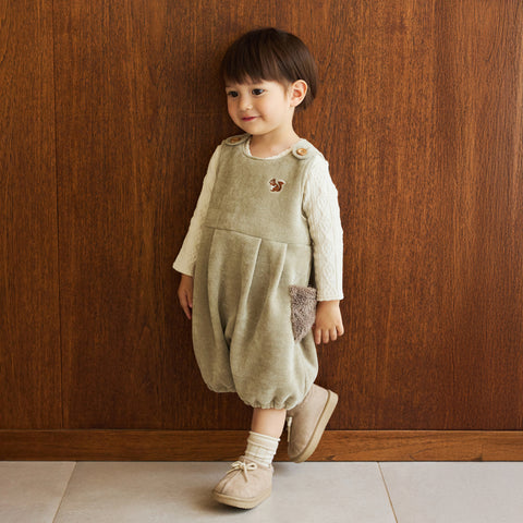 ・胸元のリス刺繍とボア生地のポケット、肩のウッドボタンがポイントのほっこりするようなサロペット。