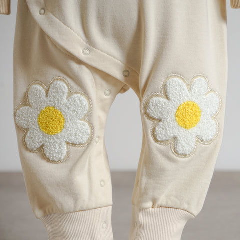 両ひざのお花ワッペンがポイントのロンパース。