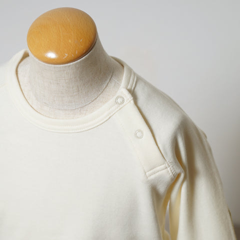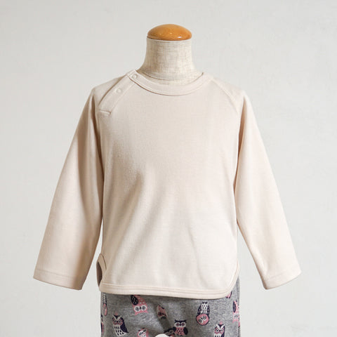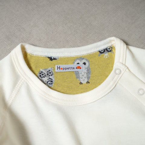 ・肌触りの良い柔らかい生地で作ったシンプルな長袖Tシャツにフクロウ柄の肘パッチを付けました。