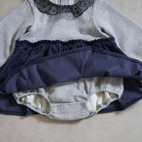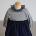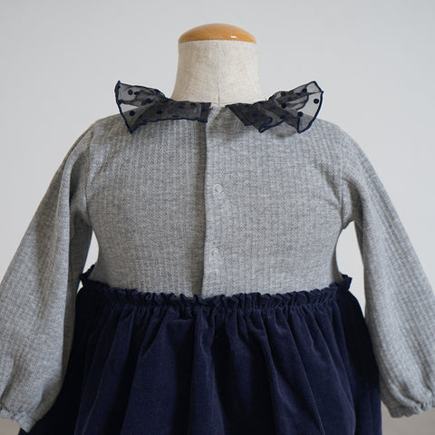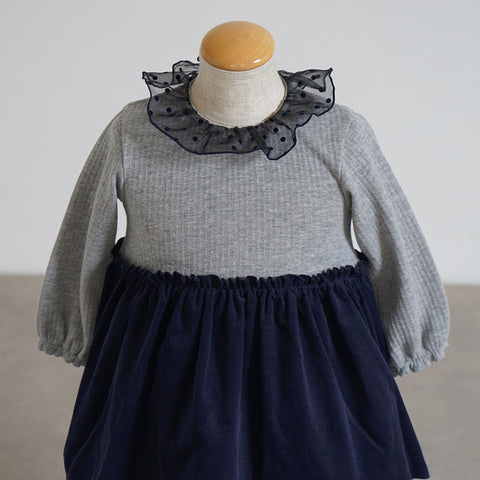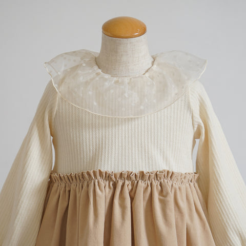 ・軽やかなドットフロッキープリントのオーガンジー生地をふわっと付けたフリル襟に、コーデュロイのスカートを合わせて、上品でお出かけにも最適な一枚に仕上げました。