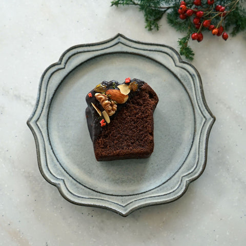 くるみやアーモンド、ピスタチオとストロベリー、オレンジなどのドライフルーツをチョコレートのパウンドケーキにトッピングしました。