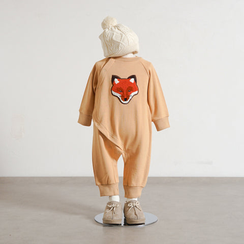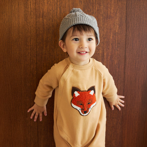 ・今期はぽこぽこした立体感のあるきつね柄のサガラ刺繍ワッペンを付けました。