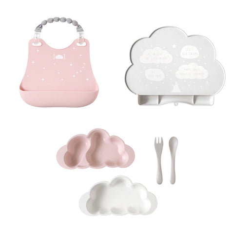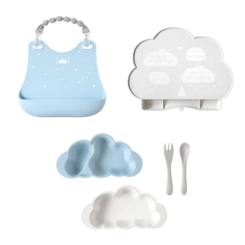 お食事をもっと楽しくする、2枚のプレートにシリコンビブとシリコンマットがついたセット。