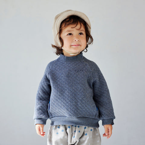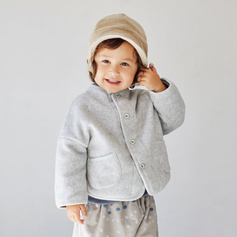 つば付きのふんわりふくらみのあるぽこぽこした生地とシャンブレーコールの生地でリバーシブルを楽しめます。