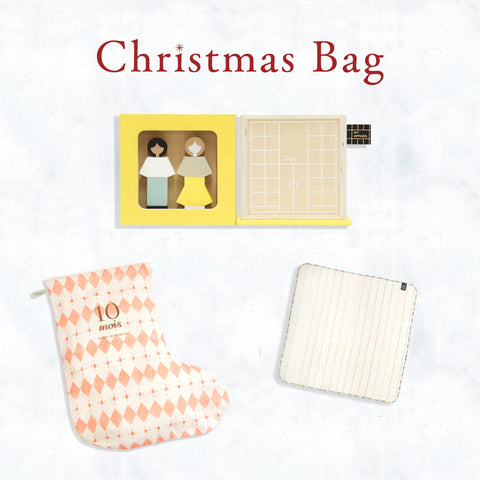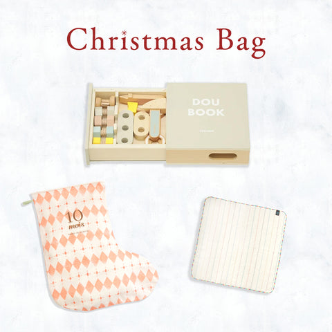 『サンタのくつ下』入り木のおもちゃと柔らかいハンカチのクリスマス限定ギフトセット。