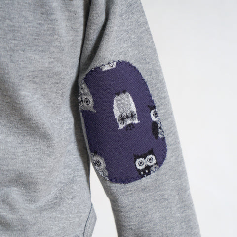 ・肌触りの良い柔らかい生地で作ったシンプルな長袖Tシャツにフクロウ柄の肘パッチを付けました。