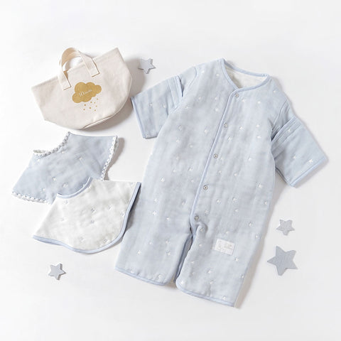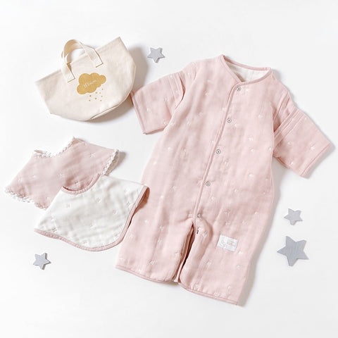 大人気のふくふくガーゼ6wayスリーパーと2wayビブをお揃いで。帆布のBAGに詰め込んだセット。
