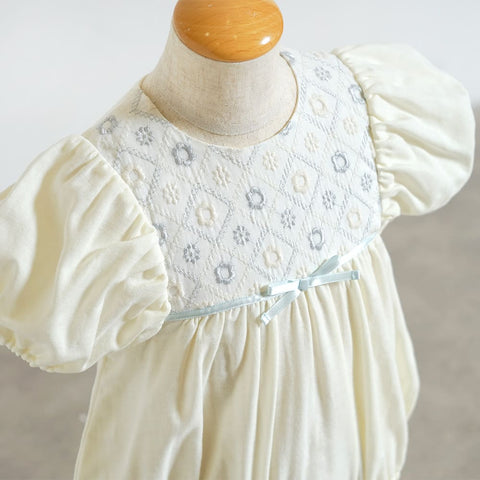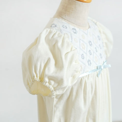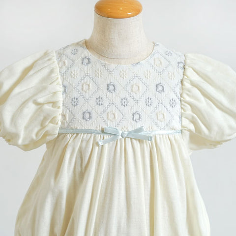 お花刺繍の生地にWガーゼ生地を合わせ、ウエストにはサテンリボンをポイントに付け上品な一枚に仕上げました。