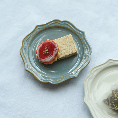 飲みやすくブレンドしたハーブティー5種類の10moisオリジナルティーとスカートのひだのようなフチが特徴の美濃焼丸小皿のセットです。