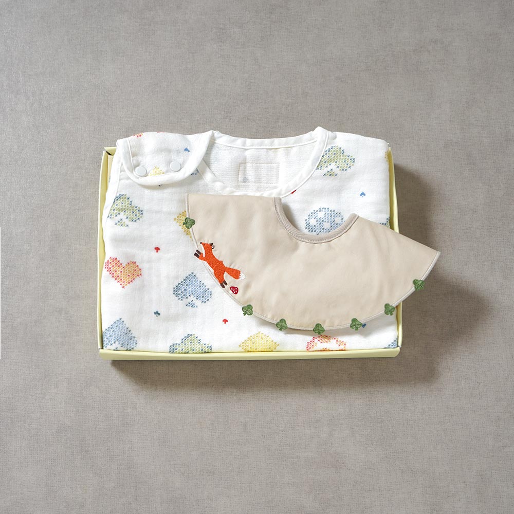 1枚で華やかになる刺繍が可愛いスタイと、なめらかな肌触りの3重ガーゼスリーパーのギフトセット。