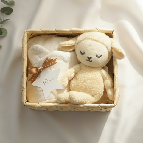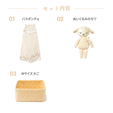 長く使えるバスポンチョとぬいぐるみをナチュラルな風合いのかごに詰め込んだギフトセット。