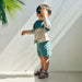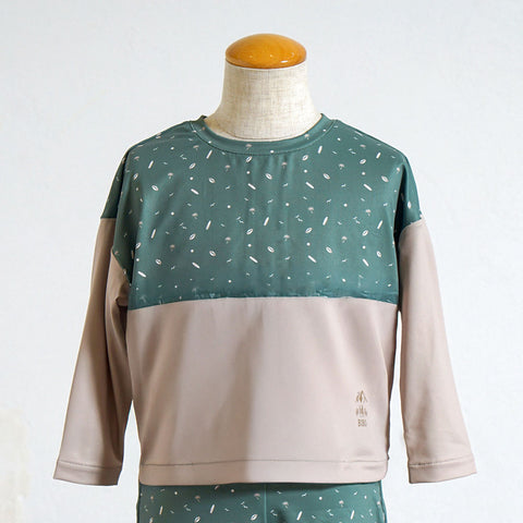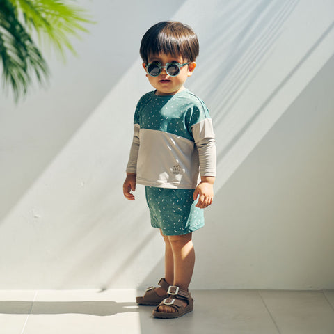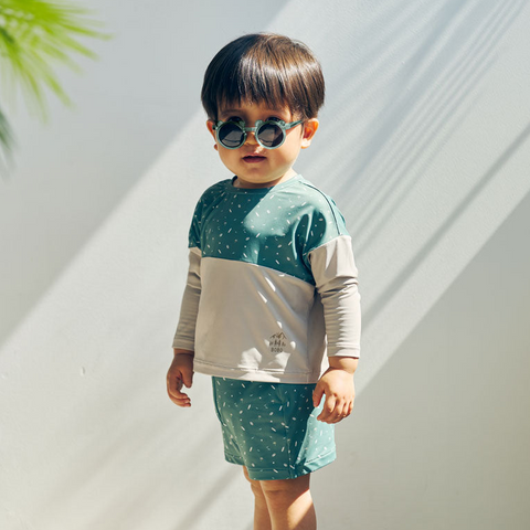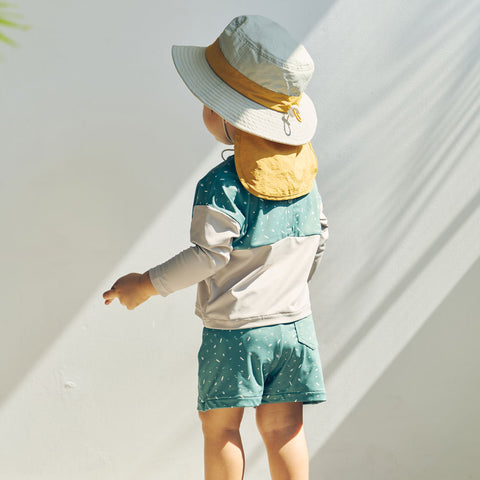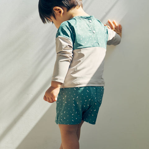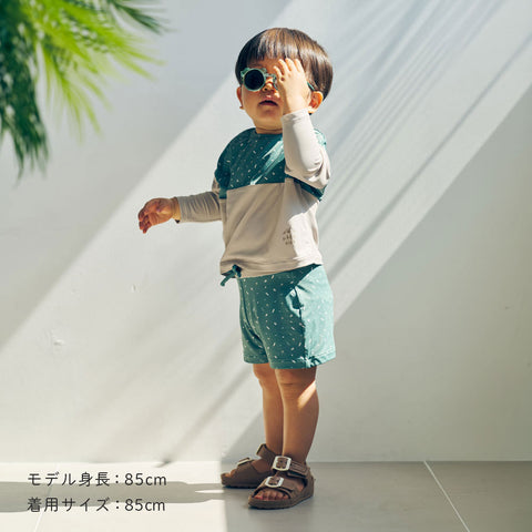 水遊びに。日焼け防止のラッシュガードと水着パンツのセット。