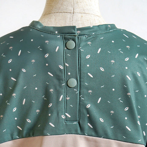 ビーチサイドをイメージした柄がちりばめられているTシャツタイプのトップスとショートパンツタイプのボトムスのラッシュガードセット。